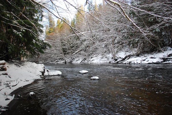 The arrangement was great, but skulking around the coastal forest alone while accessing a river that is only visible from the road in two places, scaling downed trees that match the dimensions of a 747 fuselage, sliding down steep banks and weaving around cliffs, all snow and ice covered, made me nervous. I kept thinking, If I snap a leg out here, who’s going to find me? And I feared an encounter with resident black bears, some of the largest in the world, which don’t necessarily hibernate and might be seen any day of the year.